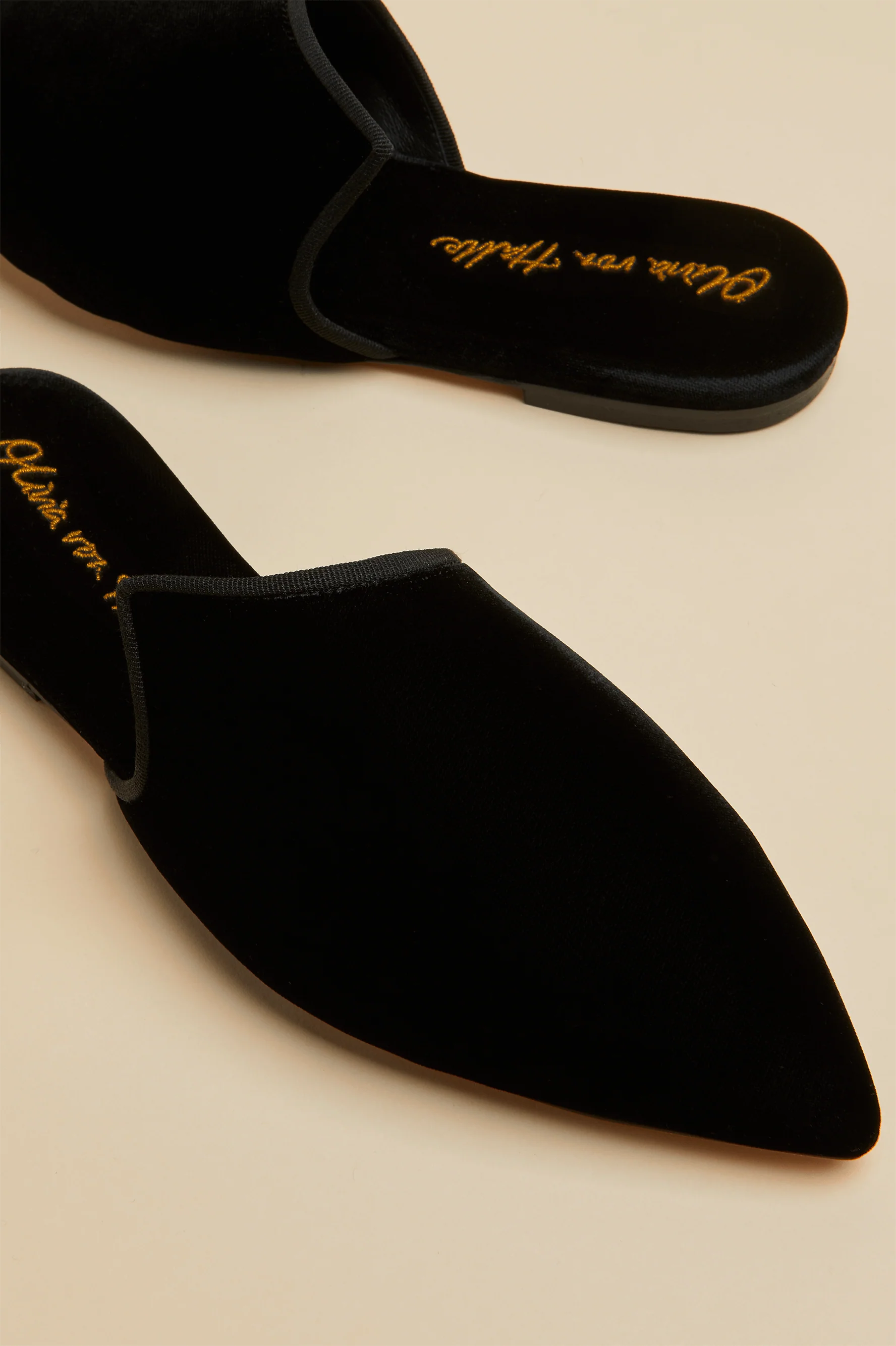 Cast in a commanding shade of black and brought to life in the most sumptuous velvet imaginable, the noble Contessa Verona slipper is an ageless classic. Ever the jetsetter, she’s been designed in Olivia von Halle’s London atelier, crafted in a family-run factory in Tuscany – and can be glimpsed by the bedsides of the most discerning dressers around the world.
